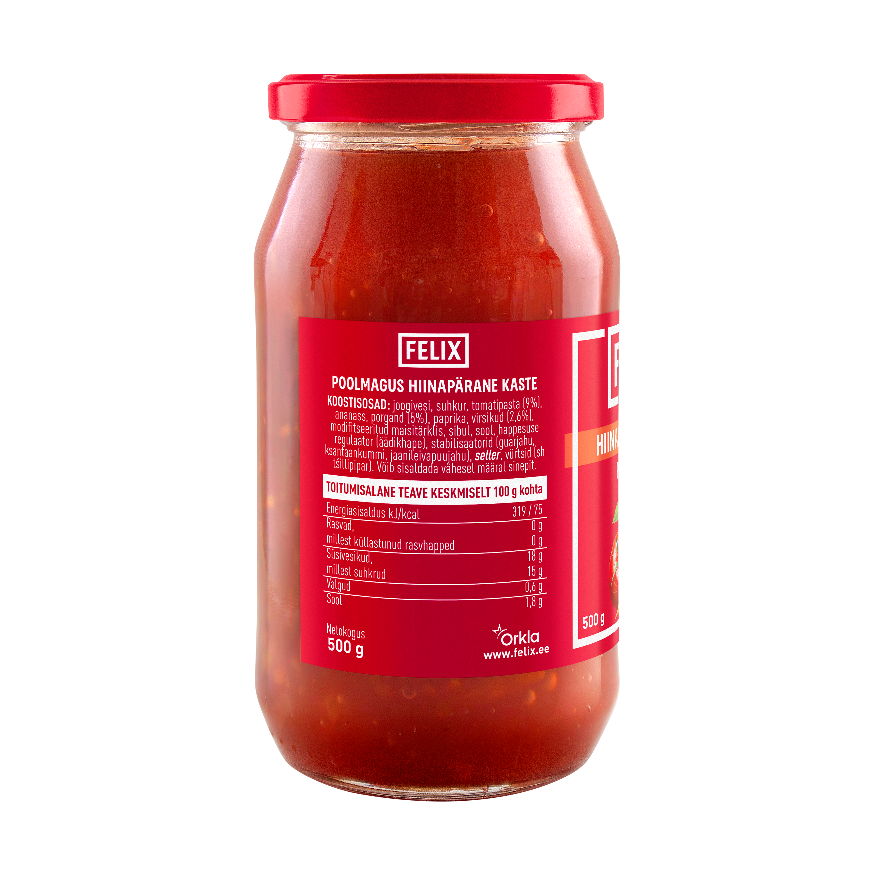 Water, sugar, tomato paste 9%, pineapples 5%, carrots, paprika, modified maize starch E1422, peaches, onions, salt, acidifier (acetic acid), spices (contain celery and chili), stabilizers (guar gum E412, xanthan gum E415, locust bean gum E410).