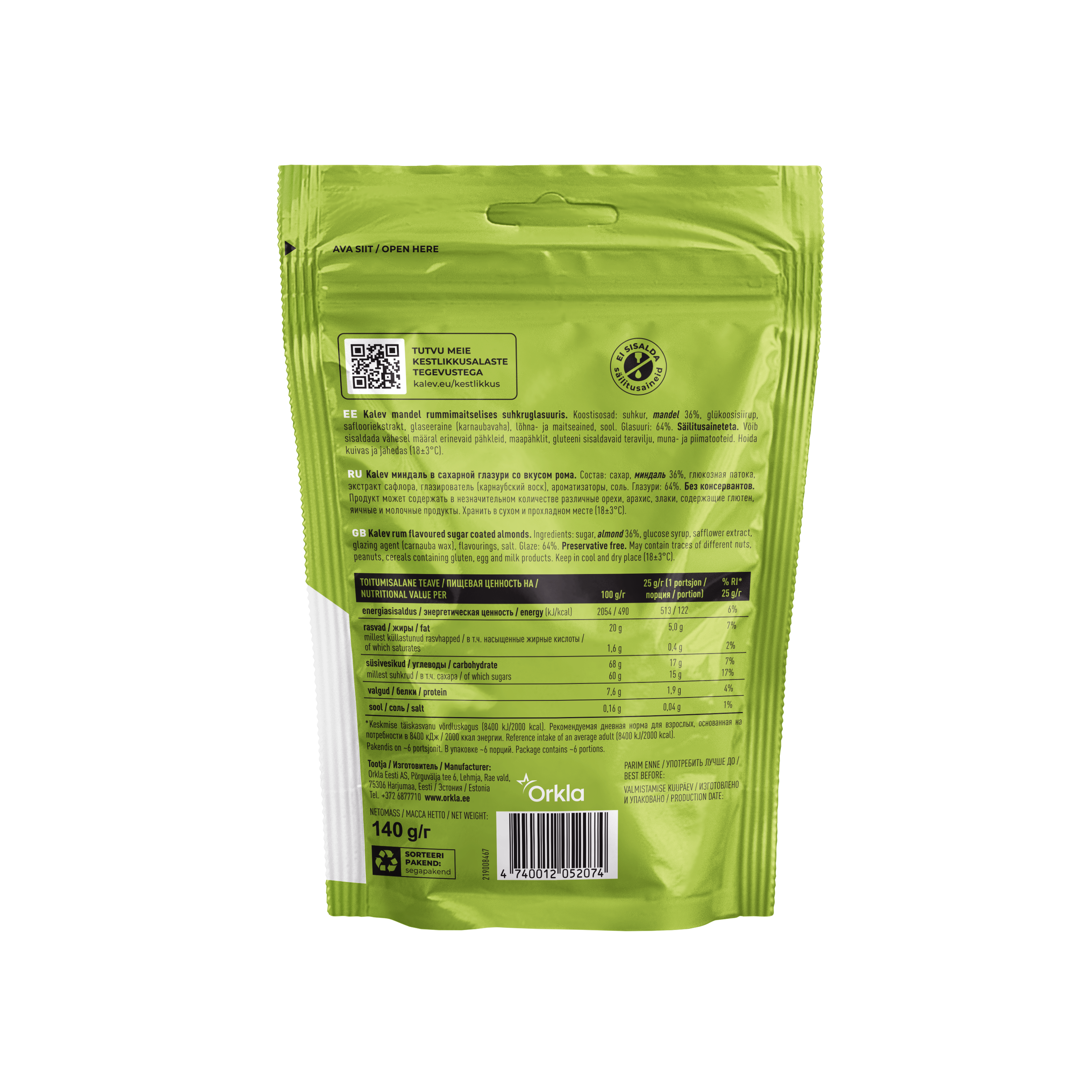 sugar, almond 36%, glucose syrup, safflower extract, glazing agent (carnauba wax), flavourings, salt. Glaze: 64%. Preservative free. May contain traces of different nuts, peanuts, cereals containing gluten, egg and milk products.