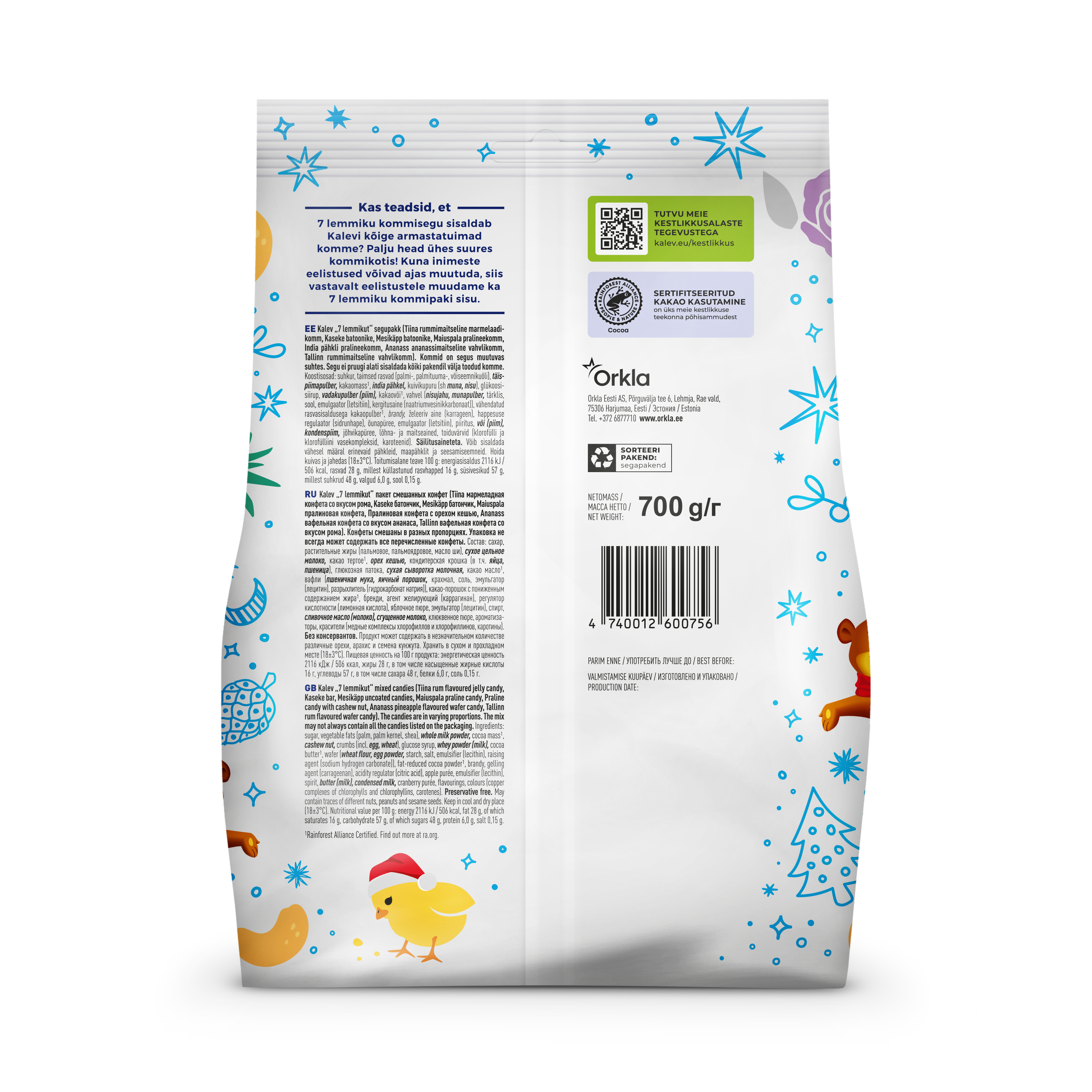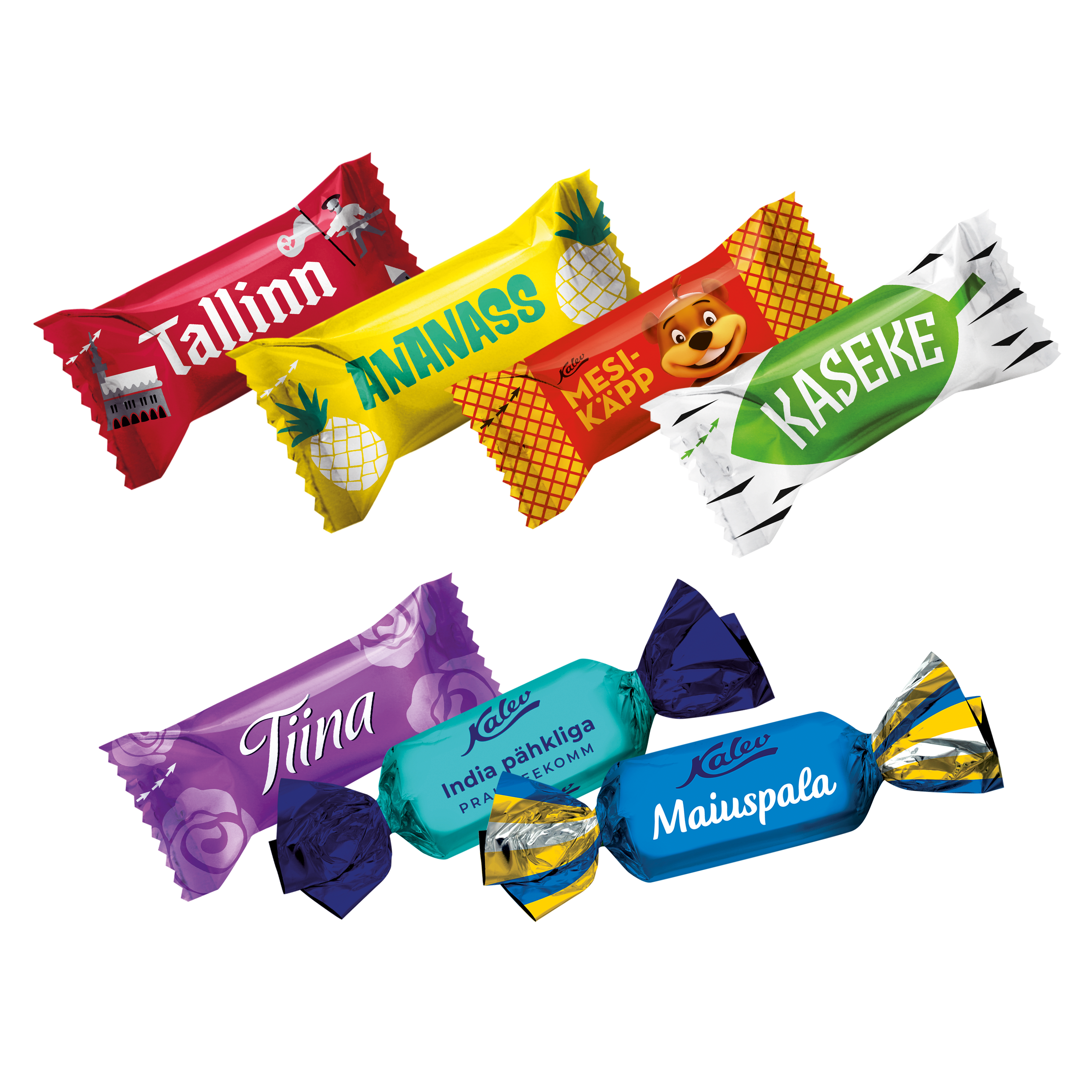сахар, растительные жиры (пальмовое, пальмоядровое, масло ши), сухое цельное молоко, какао тертое, орех кешью, кондитерская крошка (в т.ч. яйца, пшеница), глюкозная патока, cухая сыворотка молочная, какао масло, вафли (пшеничная мука, яичный порошок, крахмал, соль, эмульгатор (лецитин), разрыхлитель (гидрокарбонат натрия)), какао-порошок с пониженным содержанием жира, бренди, агент желирующий (каррагинан), регулятор кислотности (лимонная кислота), яблочное пюре, эмульгатор (лецитин), спирт, сливочное масло (молоко), сгущенное молоко, клюквенное пюре, ароматизаторы, красители (медные комплексы хлорофиллов и хлорофиллинов, каротины). Без консервантов. Продукт может содержать в незначительном количестве различные орехи, арахис и семена кунжута.