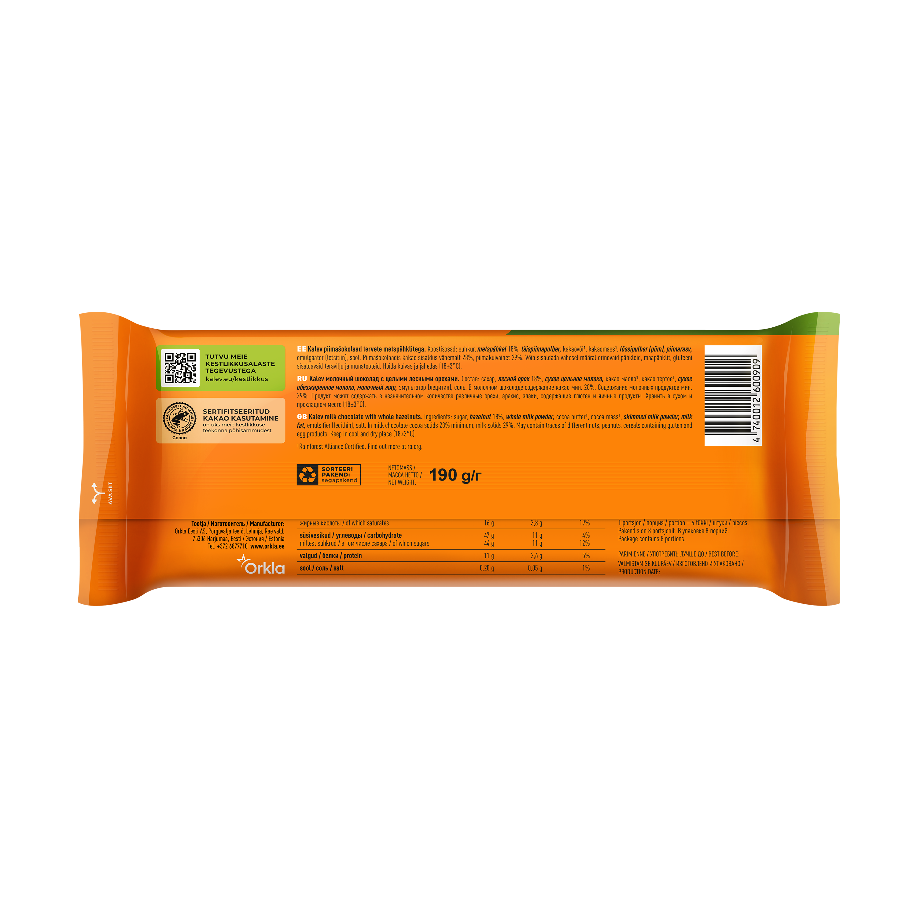 сахар, лесной орех 18%, сухое цельное молоко, какао масло, какао тертое, сухое обезжиренное молоко, молочный жир, эмульгатор (лецитин), соль. В молочном шоколаде содержание какао мин. 28%. Содержание молочных продуктов мин. 29%. Продукт может содержать в незначительном количестве различные орехи, арахис, злаки, содержащие глютен и яичные продукты.