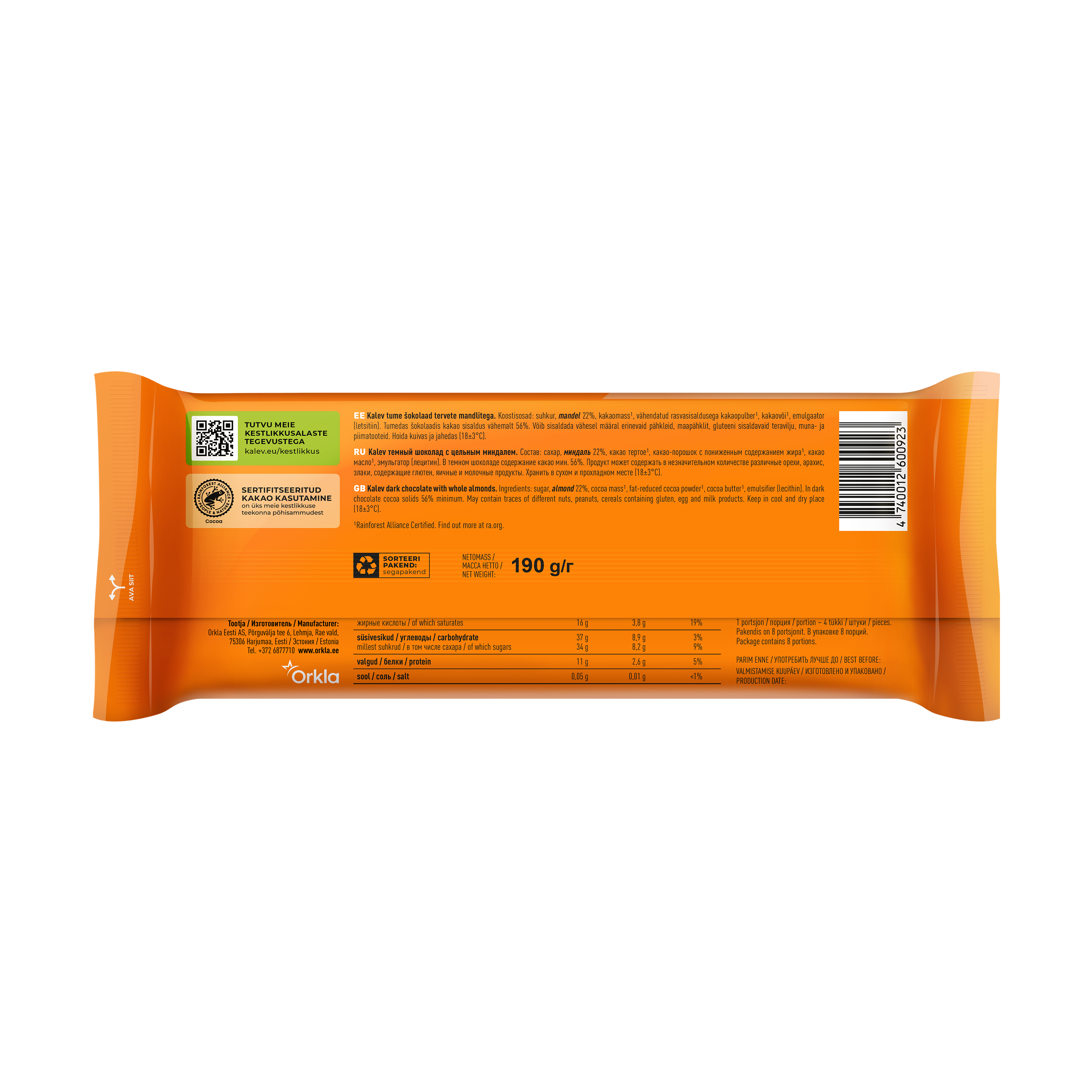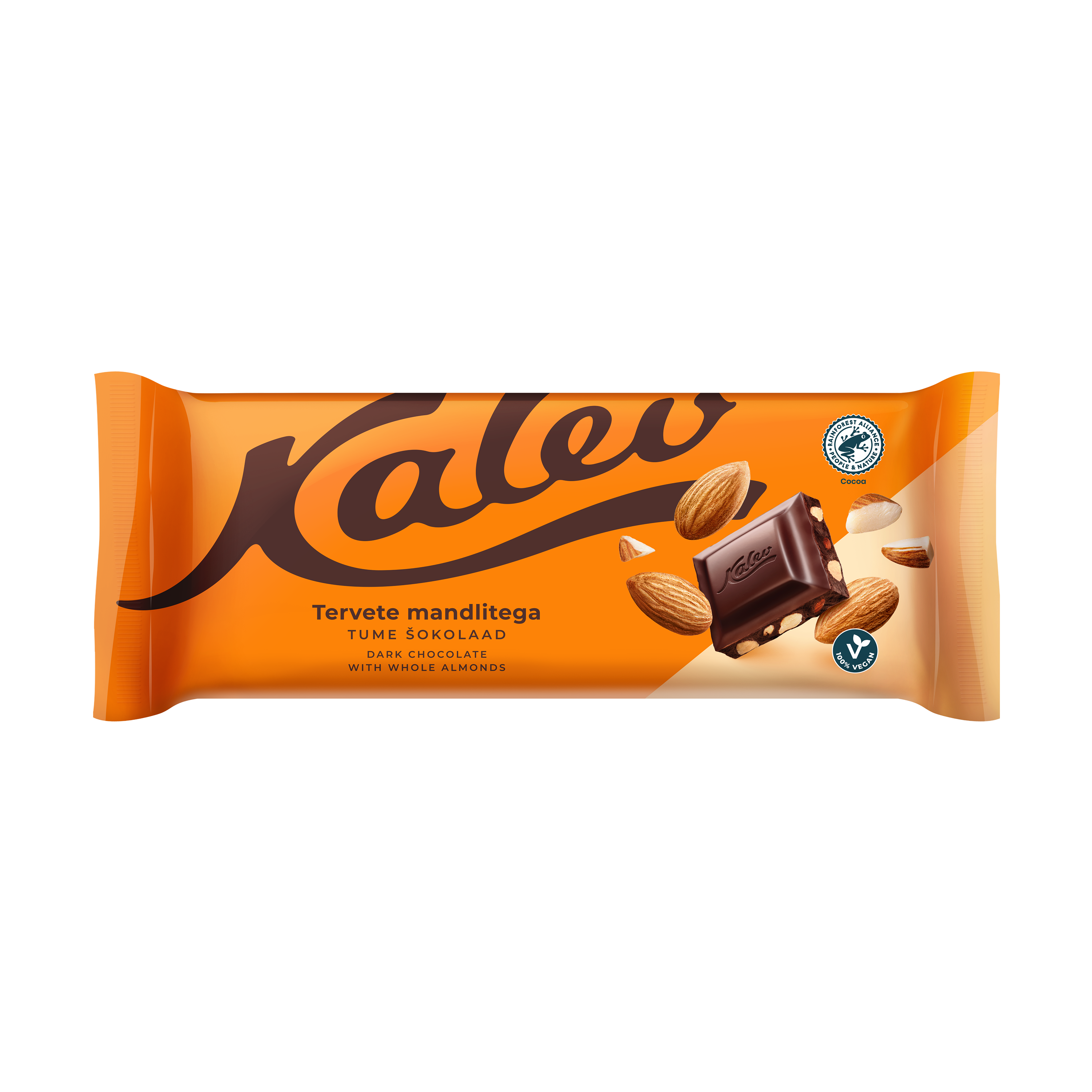 сахар, миндаль 22%, какао тертое, какао-порошок с пониженным содержанием жира, какао масло, эмульгатор (лецитин). В темном шоколаде содержание какао мин. 56%. Продукт может содержать в незначительном количестве различные орехи, арахис, злаки, содержащие глютен, яичные и молочные продукты.
