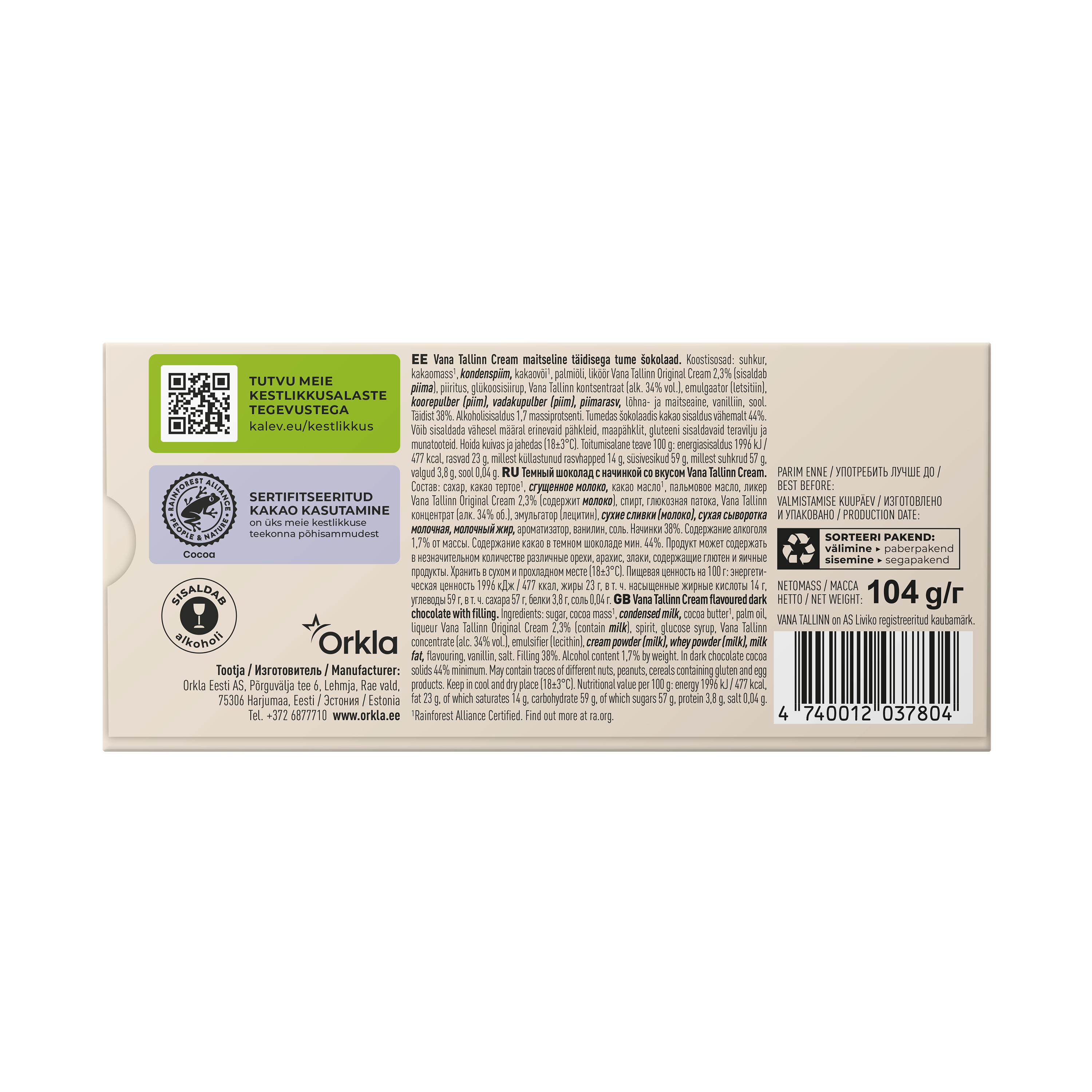 сахар, какао тертое¹, сгущенное молоко, какао масло¹, пальмовое масло, ликер Vana Tallinn Original Cream 2,3% (содержит молоко), спирт, глюкозная патока, Vana Tallinn концентрат (алк. 34% об.), эмульгатор (лецитин), сухие сливки (молоко), cухая сыворотка молочная, молочный жир, ароматизатор, ванилин, соль. Начинки 38%. Содержание алкоголя 1,7% от массы. Содержание какао в темном шоколаде мин. 44%. Продукт может содержать в незначительном количестве различные орехи, арахис, злаки, содержащие глютен и яичные продукты.