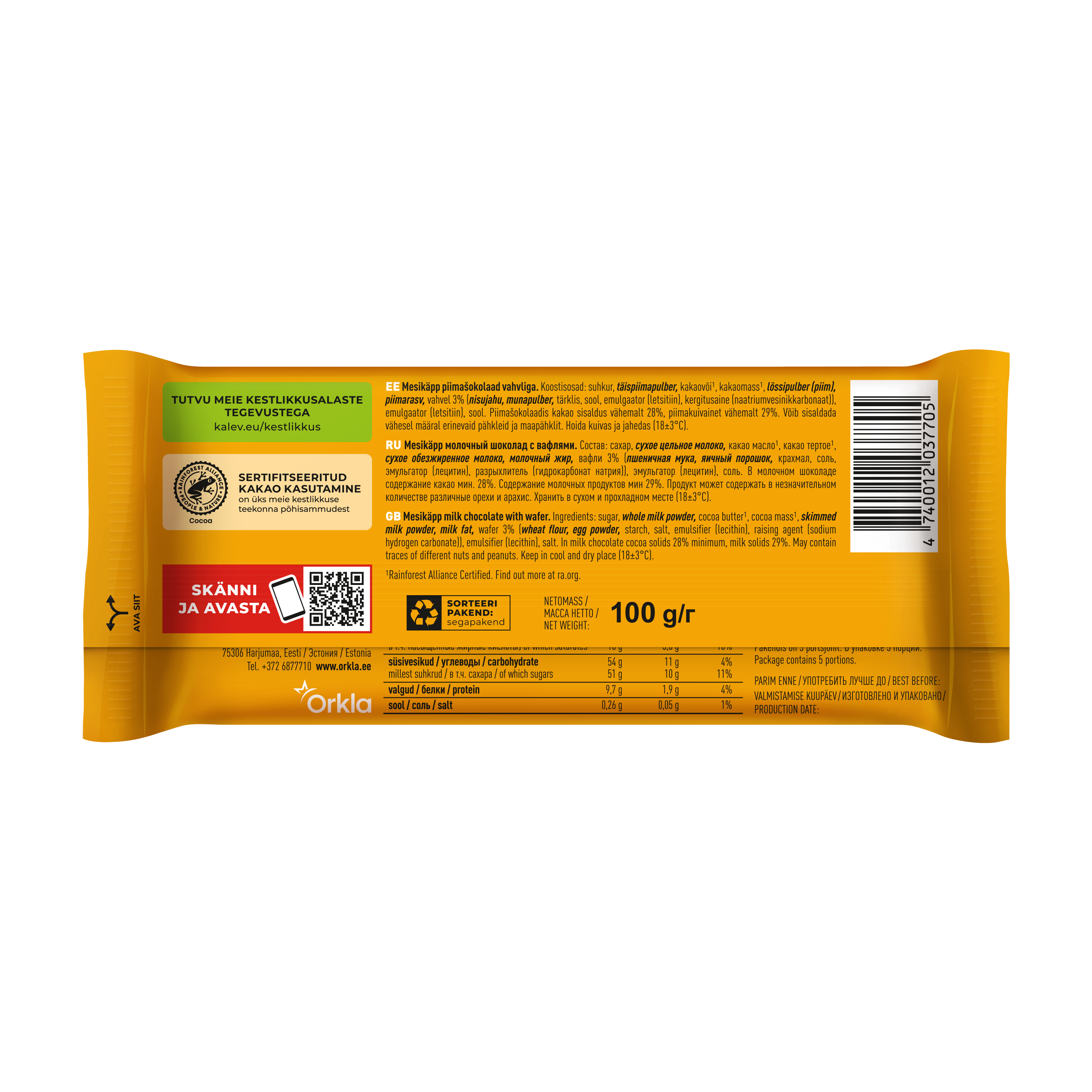 сахар, сухое цельное молоко, какао масло, какао тертое, сухое обезжиренное молоко, молочный жир, вафли 3% (пшеничная мука, яичный порошок, крахмал, соль, эмульгатор (лецитин), разрыхлитель (гидрокарбонат натрия)), эмульгатор (лецитин), соль. В молочном шоколаде содержание какао мин. 28%. Содержание молочных продуктов мин 29%. Продукт может содержать в незначительном количестве различные орехи и арахис.
