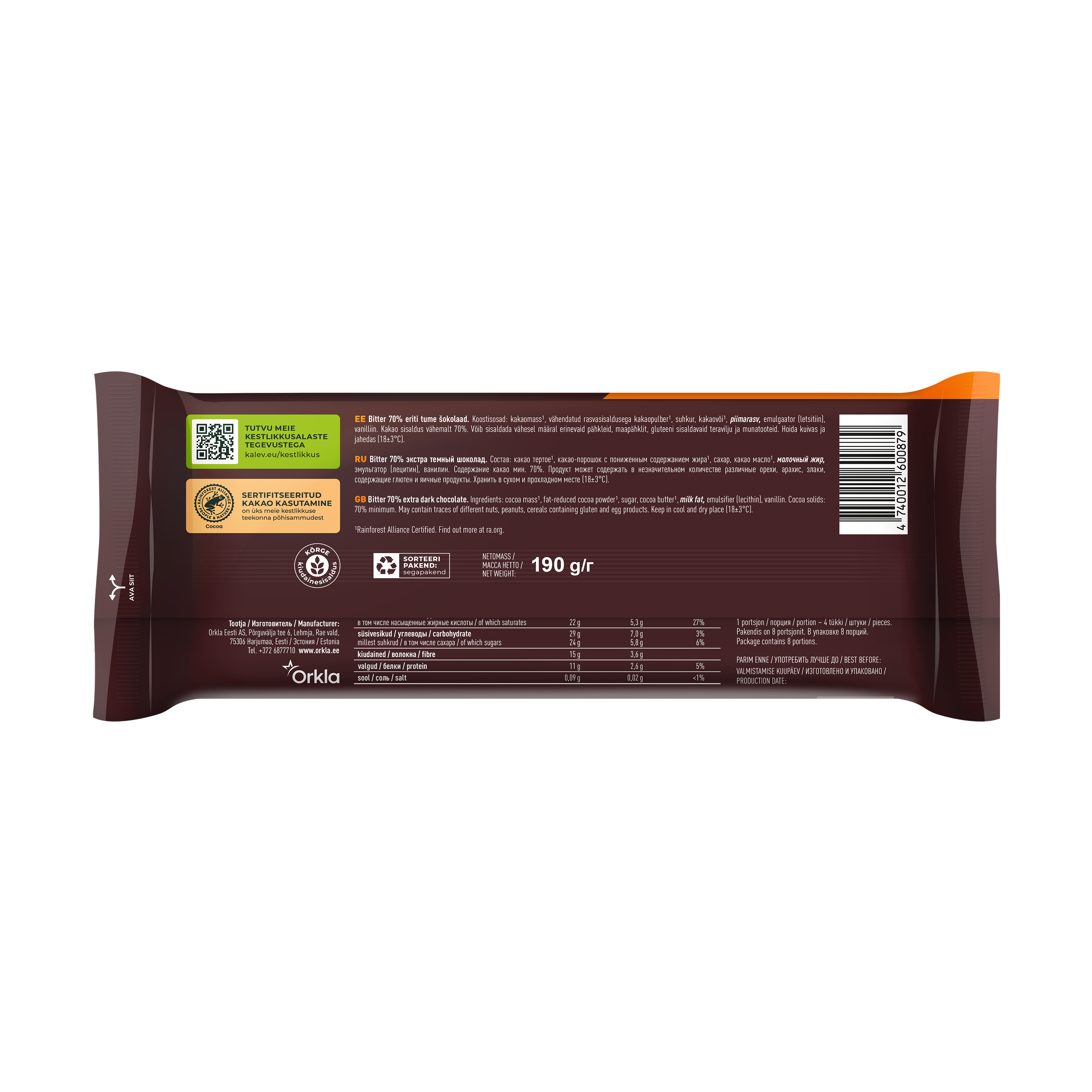 Kõrge kakaosisaldusega Bitter 70% kannab endas tumeda šokolaadi parimaid omadusi ja on meeltmööda eelkõige neile, kes eelistavad vähem magusat ja mõrkjamat šokolaadi. Tumeda šokolaadi puhul on täheldatud mitmeid kasulikke omadusi. Tegemist tõelise energiapommiga, mis sobib hästi kõigile, kelle elu on seotud vaimse või füüsilise pingutusega. Soovituslik maiustamiskogus on kaks-kolm tükikest tumedat šokolaadi päevas.