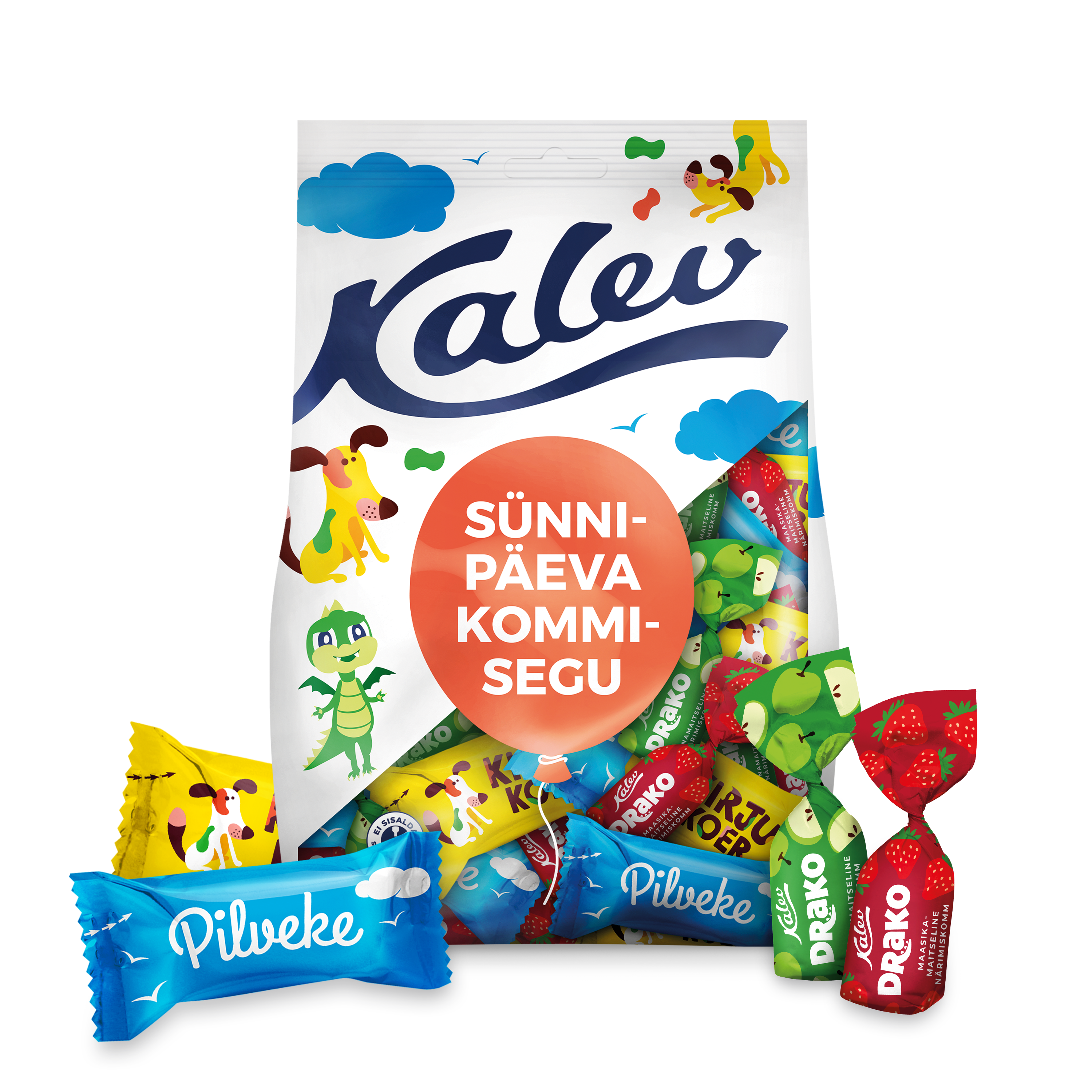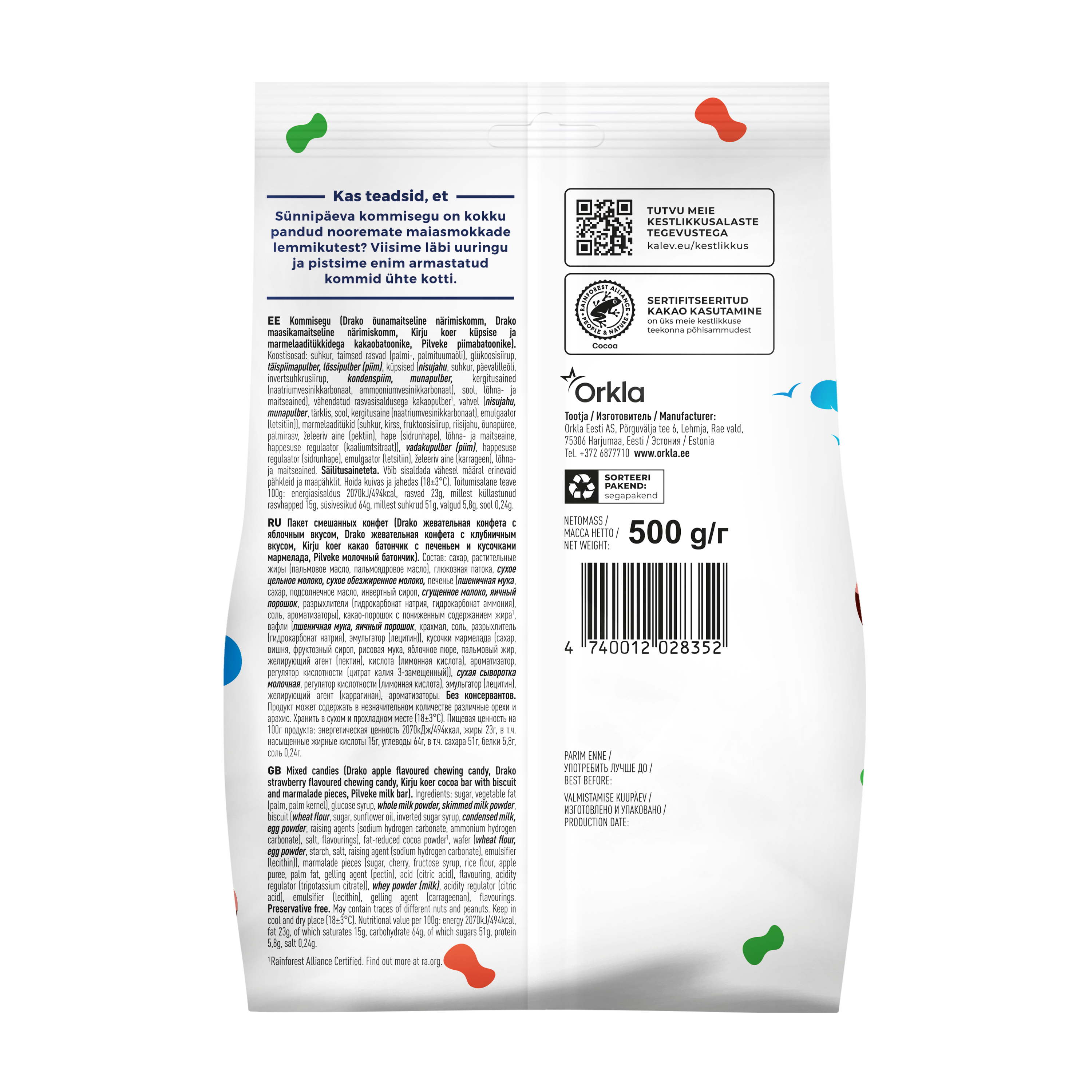 suhkur, taimsed rasvad (palmi-, palmituumaõli), täispiimapulber, lõssipulber (piim), küpsised (nisujahu, suhkur, taimne rasv (palmi-, võiseemnikutuumaõli), invertsuhkrusiirup, kondenspiim, munapulber, sool, kergitusained (E500, E503), lõhna- ja maitseaine, vanilliin), vähendatud rasvasisaldusega kakaopulber, vahvel (nisujahu, munapulber, tärklis, sool, kergitusaine E500, emulgaator (letsitiin)), marmelaaditükid (kirss, õunapüree, suhkur, fruktoosisiirup, riisijahu, taimne rasv (palmiõli), želeeriv aine (pektiin), happesuse regulaator (sidrunhape), lõhna- ja maitseaine), glükoosisiirup, vadakupulber (piim), happesuse regulaator (sidrunhape), emulgaator (letsitiin), želeeriv aine E407, lõhna- ja maitseained. Säilitusaineteta. Võib sisaldada vähesel määral erinevaid pähkleid, maapähklit ja seesamiseemneid.