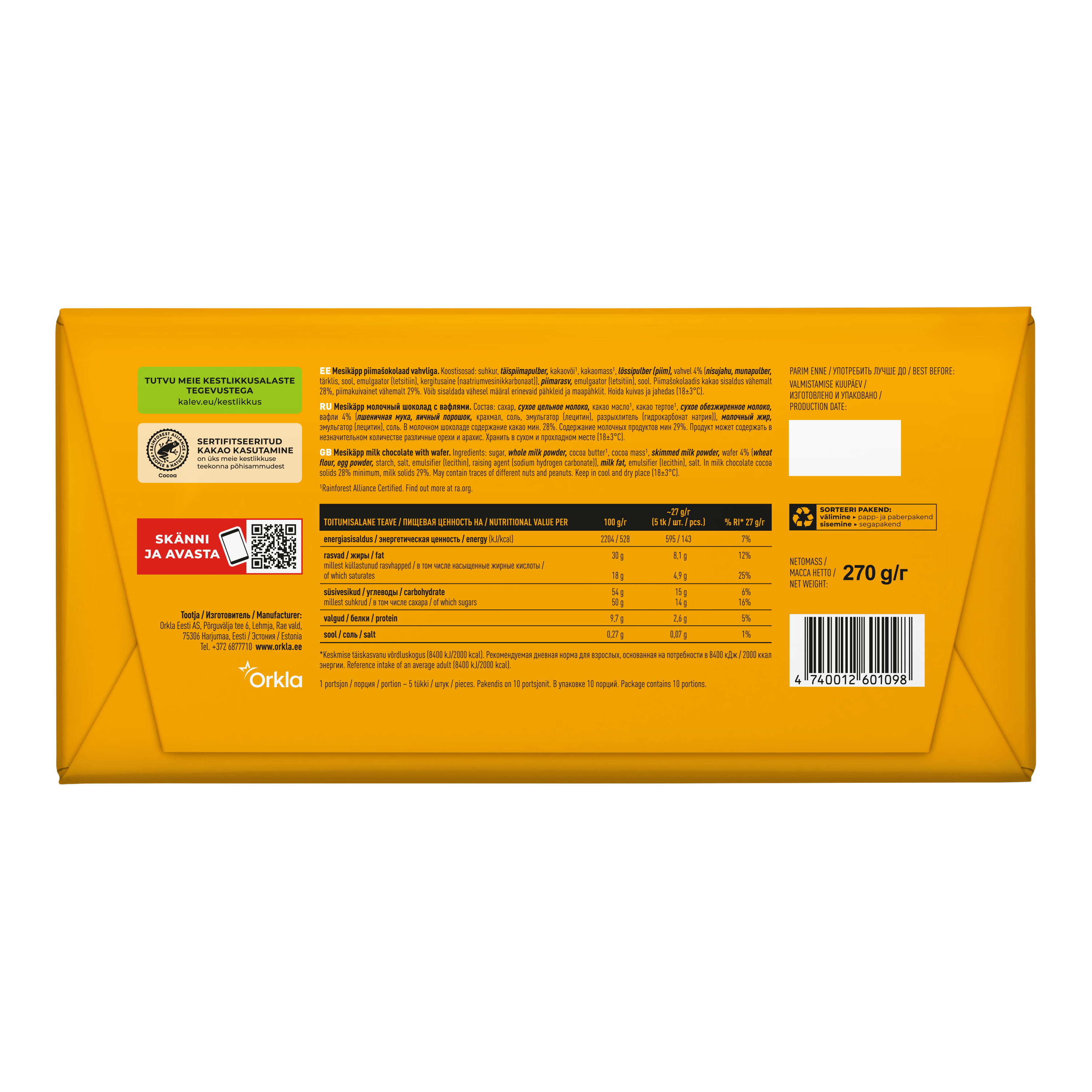 suhkur, täispiimapulber, kakaovõi, kakaomass, lõssipulber (piim), vahvel 4% (nisujahu, munapulber, tärklis, sool, emulgaator (letsitiin), kergitusaine (naatriumvesinikkarbonaat)), piimarasv, emulgaator (letsitiin), sool. Piimašokolaadis kakao sisaldus vähemalt 28%, piimakuivainet vähemalt 29%. Võib sisaldada vähesel määral erinevaid pähkleid ja maapähklit.