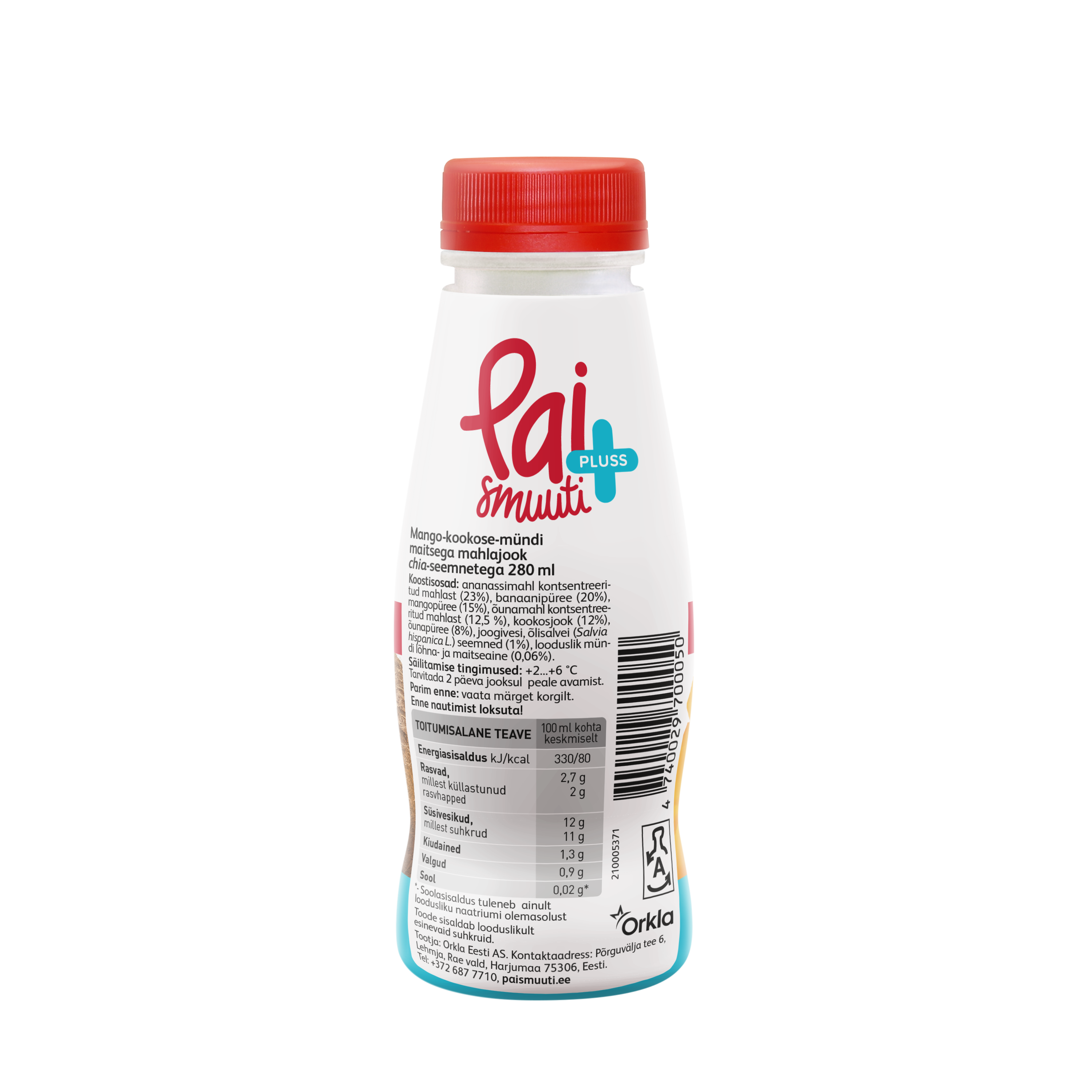 Pai pluss Mango-kookose-mündi smuuti on kiudaineterikas ning toitev vahepala. Smuuti konsistentsis on tunda chia-seemneid ning maitses lisaks mango-kookose magususele, kerget mündi värskust. Retsept on välja arendatud koostöös Fitlap toitumisnõustajatega. Ühes pudelis Mango-kookose-mündi smuutis on keskmiselt ¼ ananassi, ½ banaani, ¼ mangot, 1 õun, 2 spl (30 g) riivitud kookospähklit.