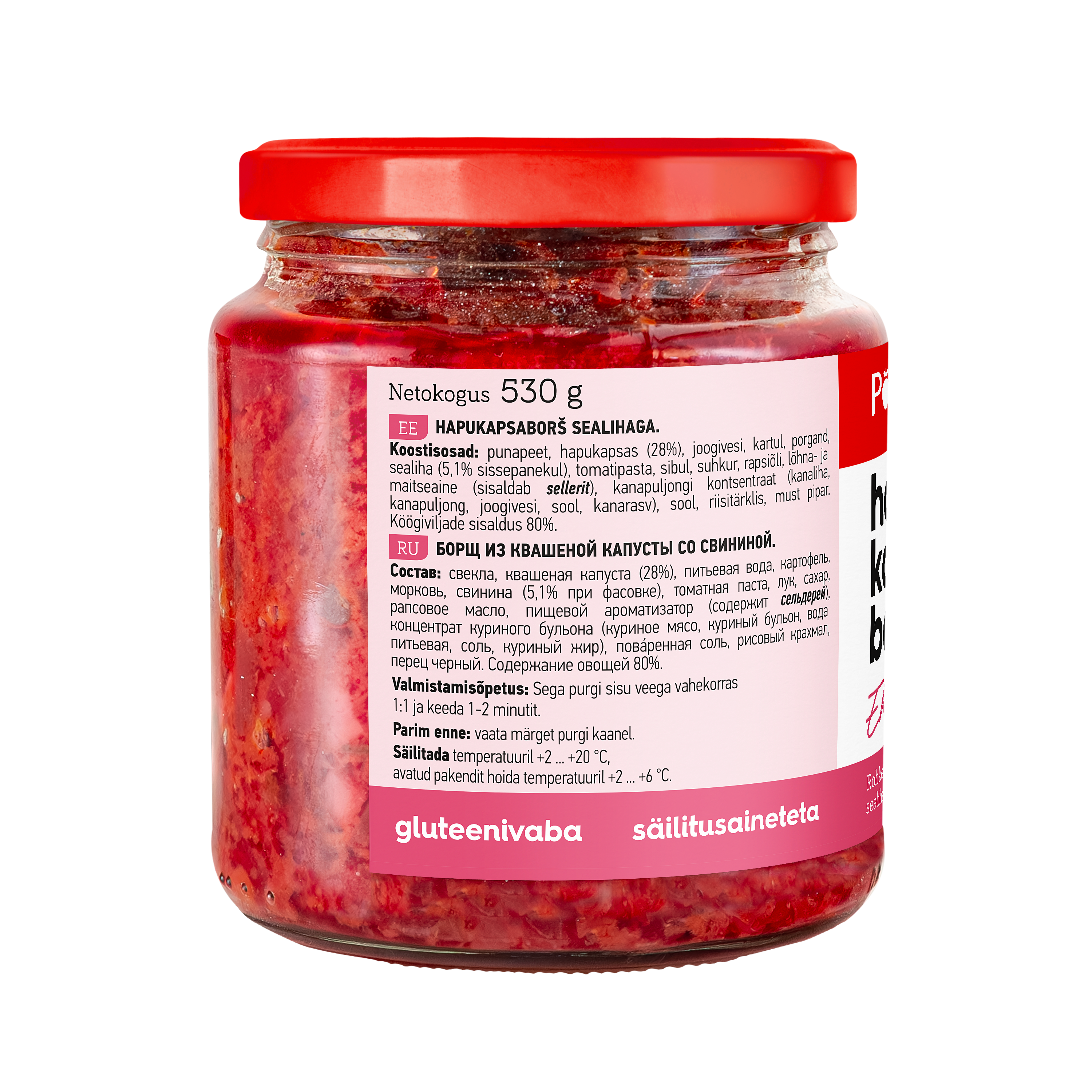 punapeet, hapukapsas (28%), joogivesi, kartul, porgand, sealiha (5,1% sissepanekul), tomatipasta, sibul, suhkur, rapsiõli, lõhna- ja maitseaine (sisaldab sellerit), kanapuljongi kontsentraat (kanaliha, kanapuljong, joogivesi, sool, kanarasv), sool, riisitärklis, must pipar. Köögiviljade sisaldus 80%